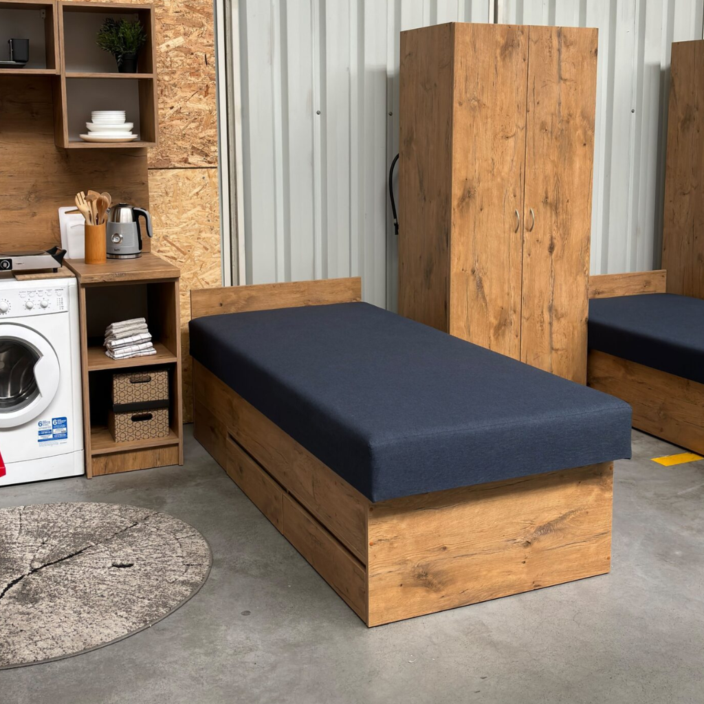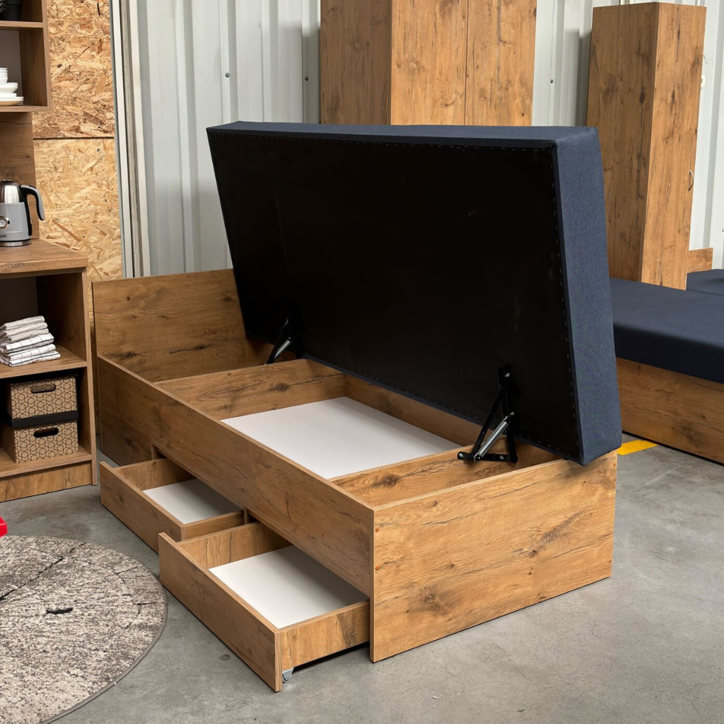 - Konstrukcja: Łóżko otwierane z szufladami, zapewniające dodatkową przestrzeń do przechowywania.