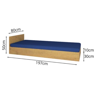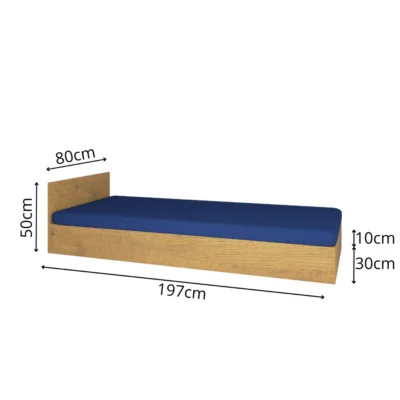 Tapczan otwierany z zagłówkiem o wymiarach 197 cm (długość) x 80 cm (szerokość) x 40 cm (wysokość), wykonany z płyty meblowej i przeznaczony pod wyposażenie m.in. kwater pracowniczych, pensjonatów i hosteli.